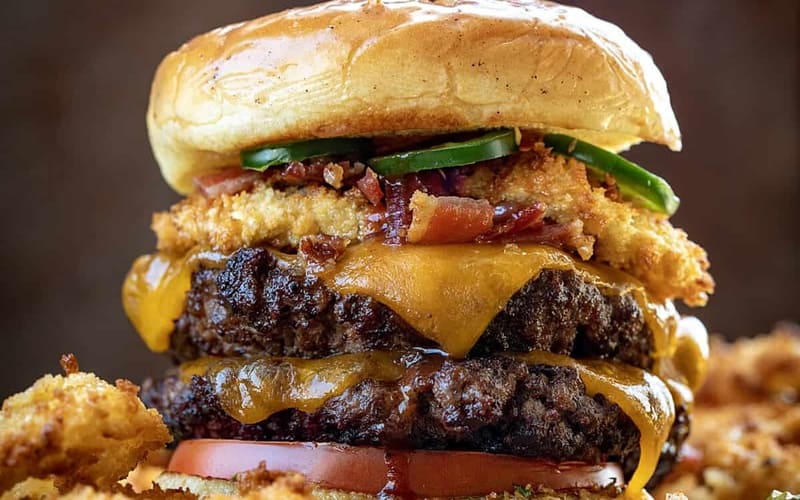 Prawdziwy męski burger Rodeo z soczystym kotletem wołowym, chrupiącym bekonem, serem cheddar, marynowanymi ogórkami, świeżą sałatą i autorskim sosem. Podawany