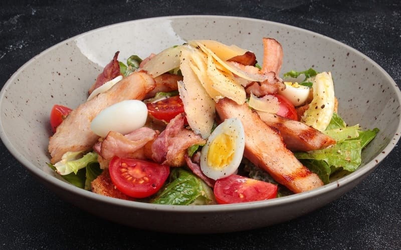 Lekka, a jednocześnie pożywna sałatka Cezar z delikatnym kurczakiem grillowanym, chrupiącymi liśćmi sałaty lodowej, aromatycznymi grzankami, parmezanem i klasycznym sosem