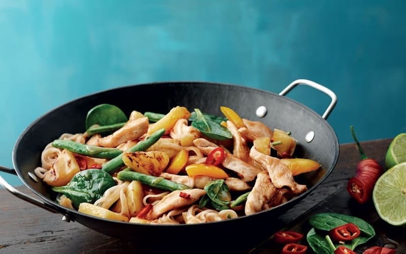 Aromatyczny kurczak Wok z soczystym filetem z kurczaka, świeżymi warzywami (brokuły, marchewka, papryka, cebula) i tradycyjnym sosem sojowym. Szybkie i