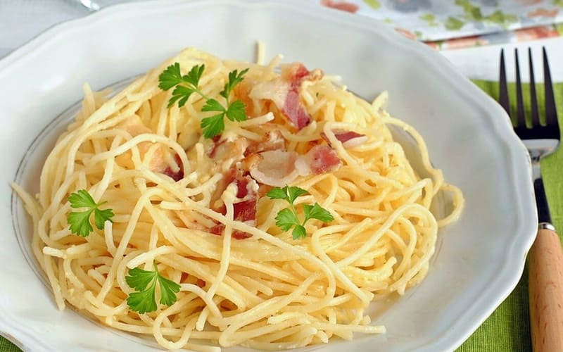 Kremowy makaron Carbonara według klasycznego włoskiego przepisu: spaghetti, smażona pancetta lub bekon, żółtko, ser parmezan i czarny pieprz. To tradycyjne